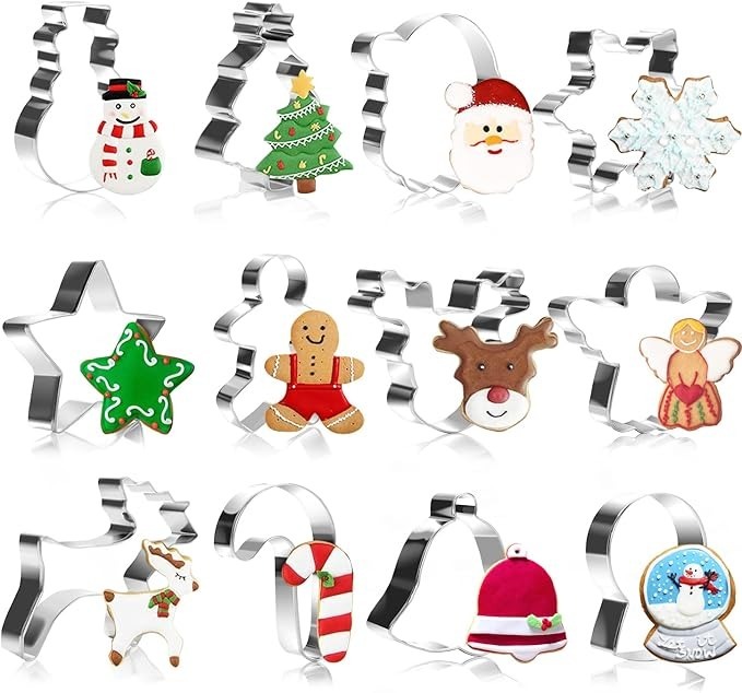 Set-Zusammensetzung & Formenvielfalt: Das Set beinhaltet 12 verschiedene Weihnachtsmotive, darunter Weihnachtsbaum, Weihnachtsmann, Rentier, Glocken und Herz.